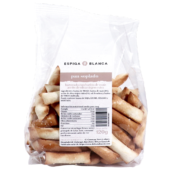Harina de TRIGO, harina de maíz (8,4%), aceite de oliva virgen extra (4,8%), sal, levadura y harina de TRIGO malteada.